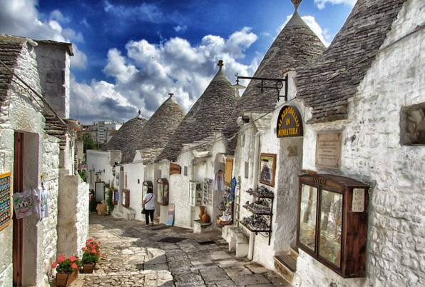 Alberobello ir trulli māju galvaspilsēta. Šīs neparastās baltās ēkas piepilda šaurās ieliņas. Ir trulli restorāni, trulli veikali un pat trulli katedrāle. Alberobello māju smailie jumti, līdzīgi rūķu cepurēm, ir redzami gandrīz katra reģiona apmeklētāja fotoalbumos, rotājot brošūras, plakātus un grāmatas. Alberobello ir pilsēta patīkamām pastaigām un tūristu iepirkšanās iespējām: trulli ielās tiek piedāvāts plašs suvenīru un vietējo amatnieku izstrādājumu klāsts, sākot no rokām darinātām lellēm līdz tradicionālajai keramikai. Un, protams, Apūlijas produkti: sieri un aukstie gaļas izstrādājumi, olīveļļa un vīns, mājās gatavoti ievārījumi un garšvielas, saldumi un liķieri, kurus mēs noteikti nogaršosim…